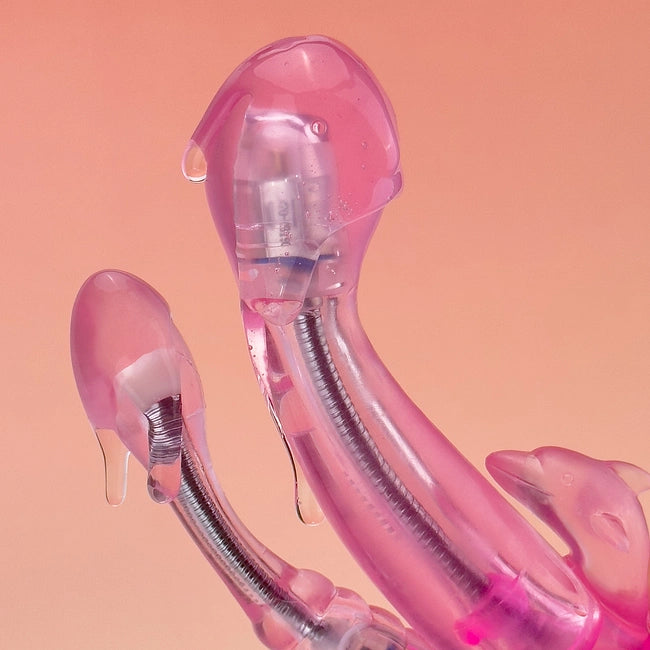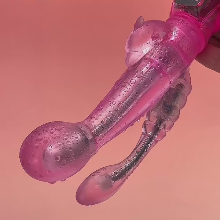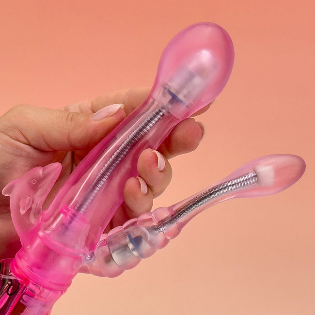 Multi-functional waterproof TPR triple vibrator with dolphin clitoral tickler, bendable shaft and anus stimulator. Features different patterns of escalating, pulsating, surging and vibration.