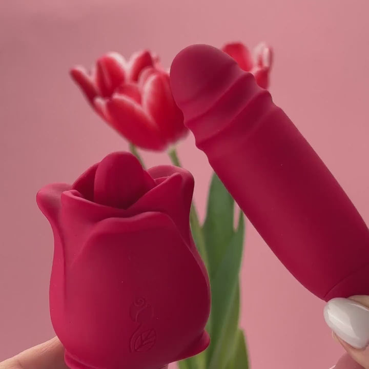 Get ready to bloom with ecstasy with this dual-action vibrator. With its tantalizing tongue on the rose and insertable thrusting dildo, it offers an unforgettable pleasure. Melt in 10 tempting licking modes and 10 thrilling thrusting modes for a ride you'll never forget.