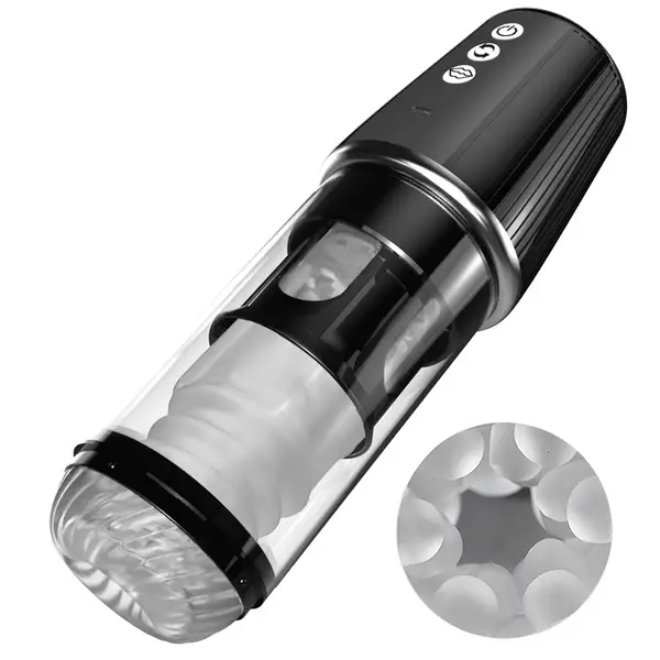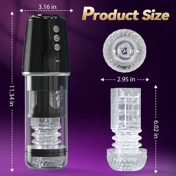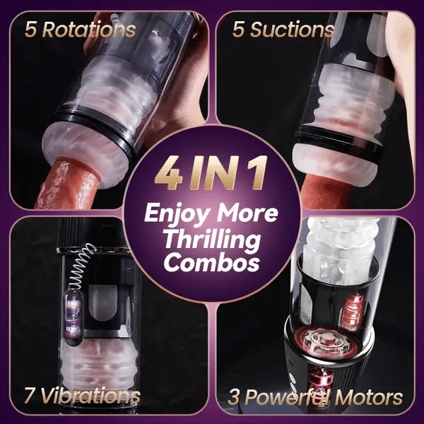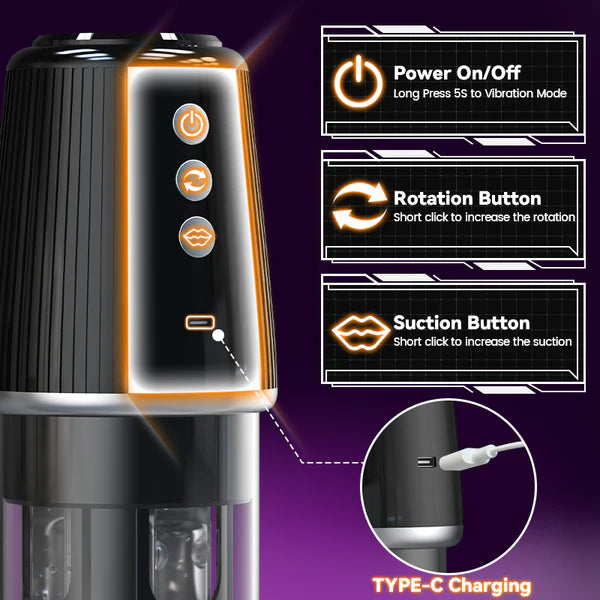 Multi-Dimensional Pleasure: Dive into a sea of ecstasy with 5 rotating, 5 sucking, and 7 vibrating modes. Whether you crave a singular sensation or a symphony of stimulation, this masturbation cup adapts to your desires, offering a spectrum of pleasure experiences. Dual-Purpose Design: Elevate your solo play and training sessions with powerful suction capabilities. This 2-in-1 marvel not only delivers intense pleasure but also aids in enhancing endurance, blending enjoyment with performance improvement. Triple Motor Power: Equipped with an N20 vibration motor, a 370 air pump, and a dedicated rotation motor, our device guarantees stability and strength in function. Experience the relentless power and precision that takes your pleasure to new peaks. Luxurious Silicone Sleeve: Immerse yourself in the indulgence of a silicone inner sleeve featuring a 0.98-inch thick entrance and 3-tiered texture for a massage that feels as real as it gets. The soft, comfortable embrace of our device offers an authentic experience designed to satisfy. Visual Excitement: Catering to your voyeuristic desires, the transparent cup allows you to witness the action. With three easy-to-use buttons, control is at your fingertips, making it effortless to navigate through modes and find your perfect setting.?